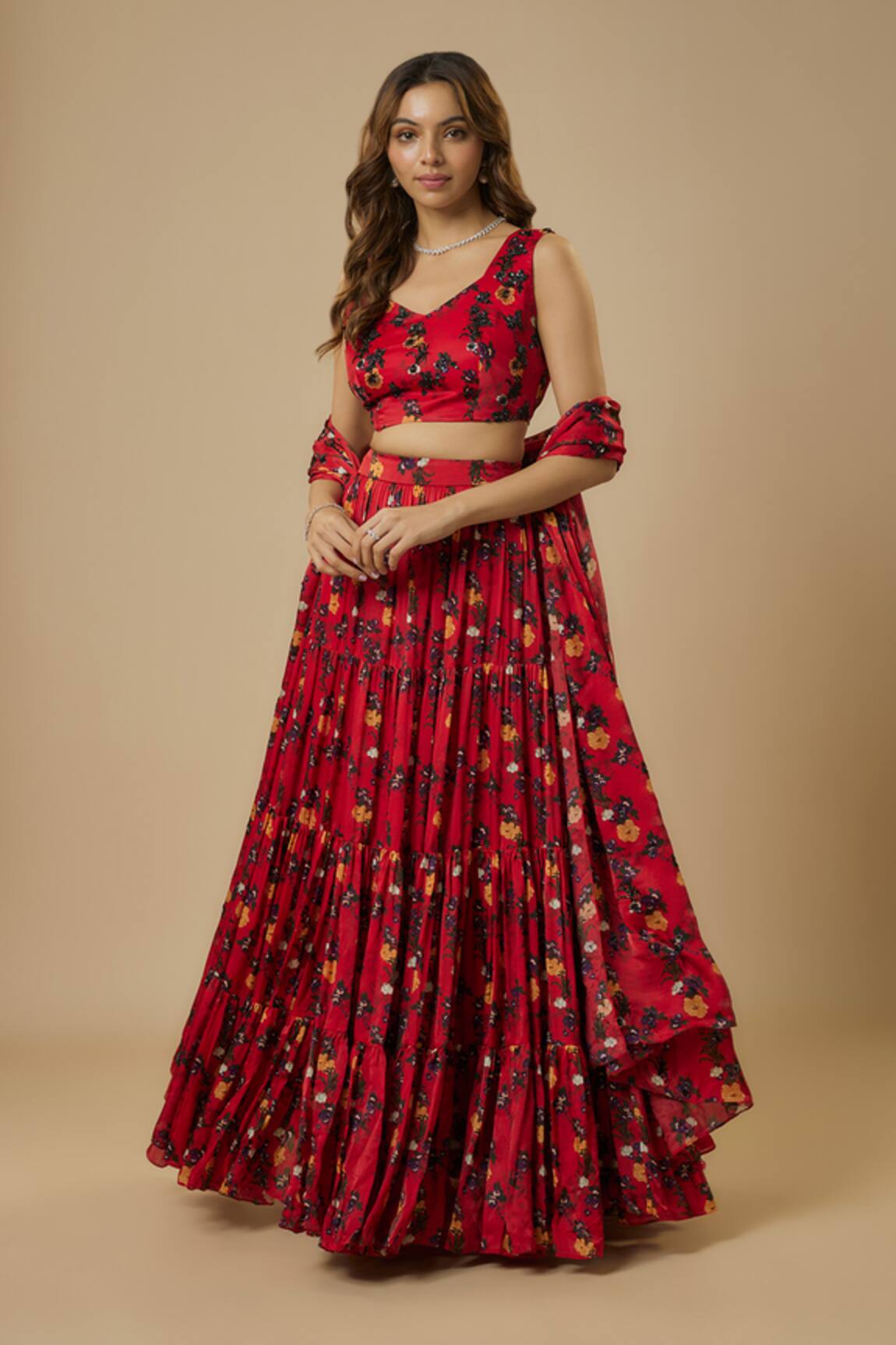 Printed Ruffled Tiered Pre-Draped Saree With Blouse