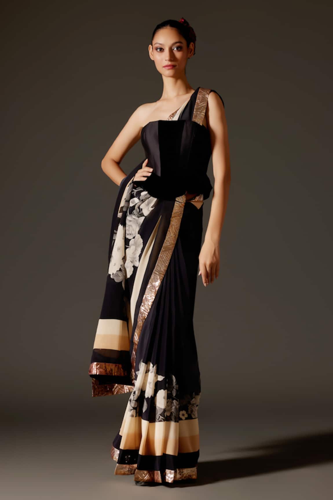 Flower Vine Print Saree & Unstitched Blouse Piece Set