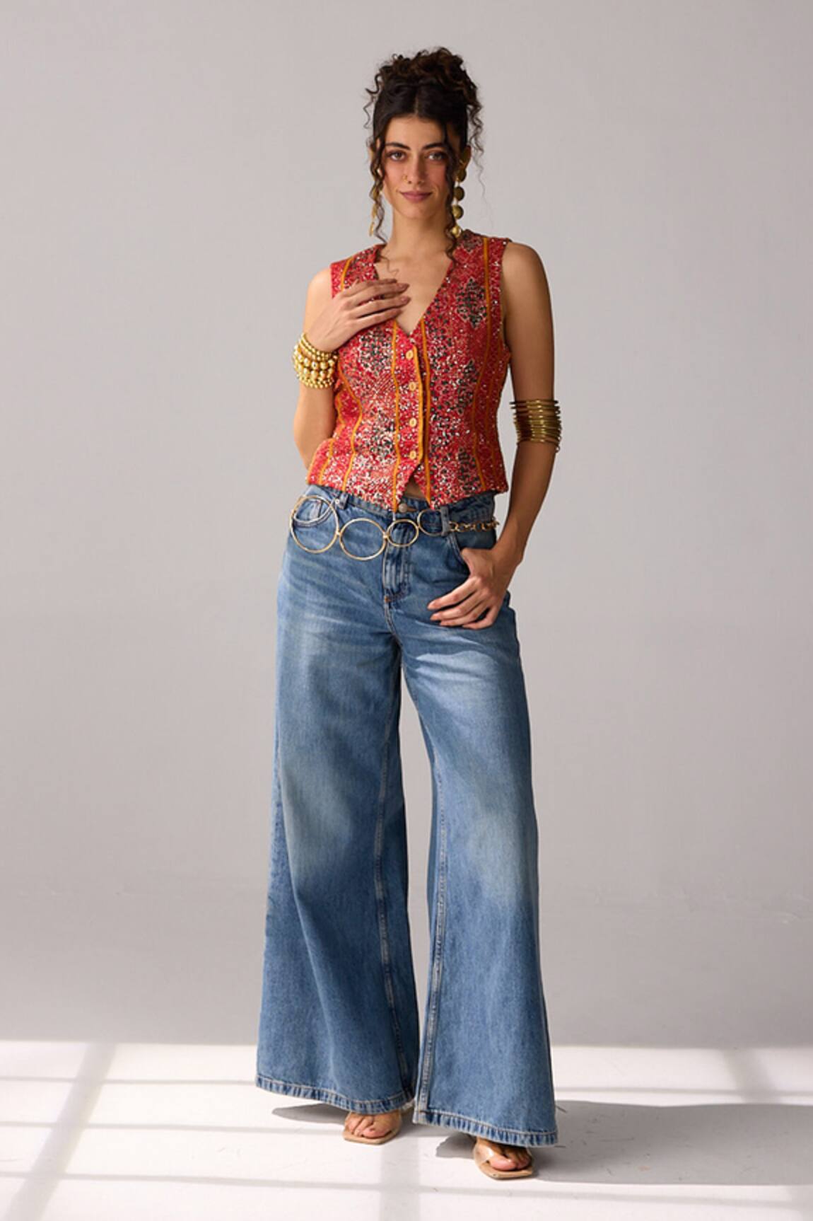 Color Block Lurex Floral Print Top