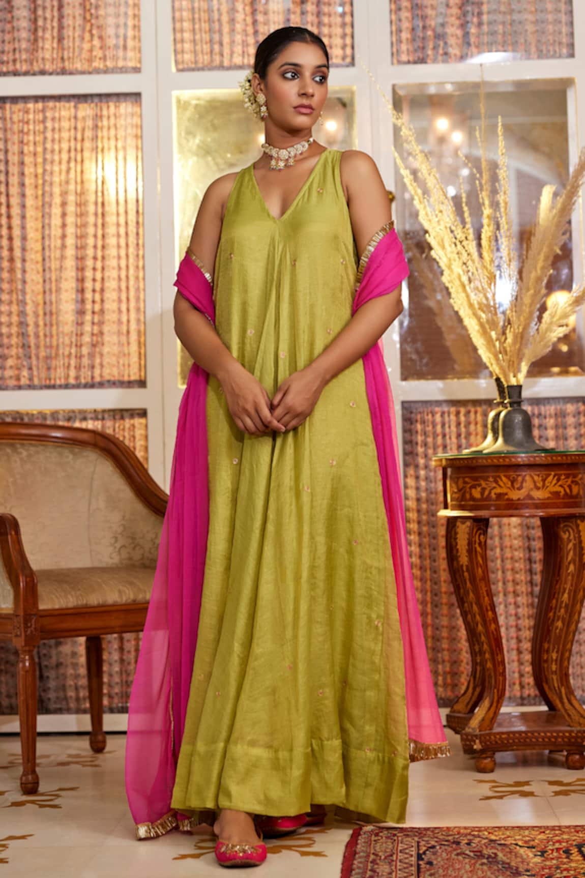 Gathered Bodice Gown With Dupatta