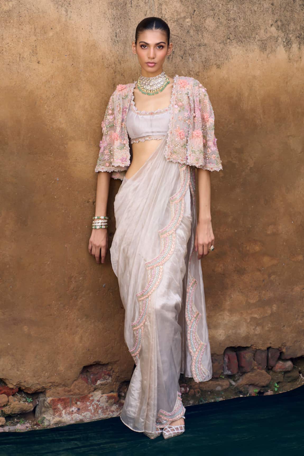 Nayyara Embroidered Scallop Hem Saree Set With Jacket