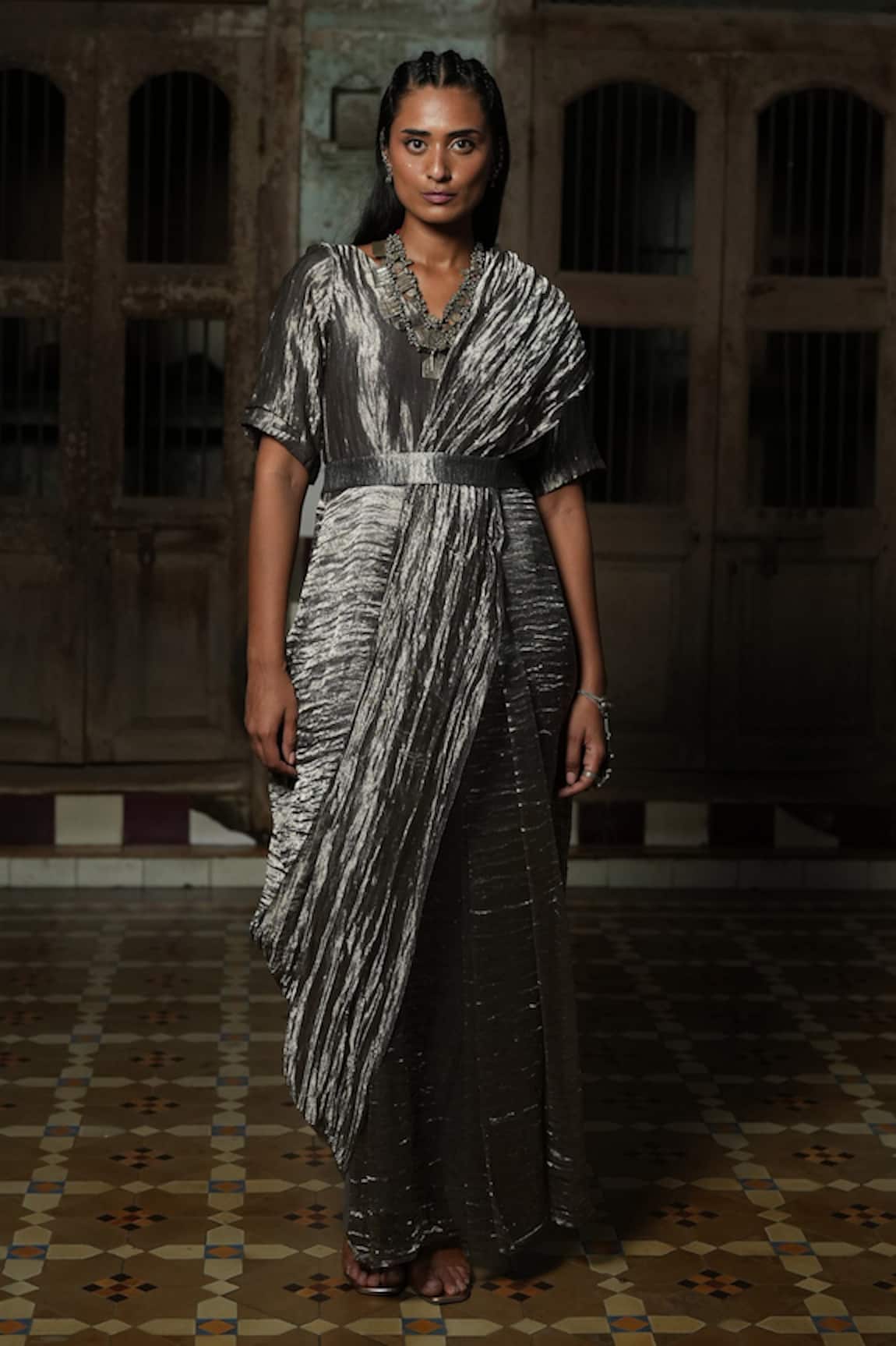 Brown Kasab Thread Overlay Jacket & Skirt Set