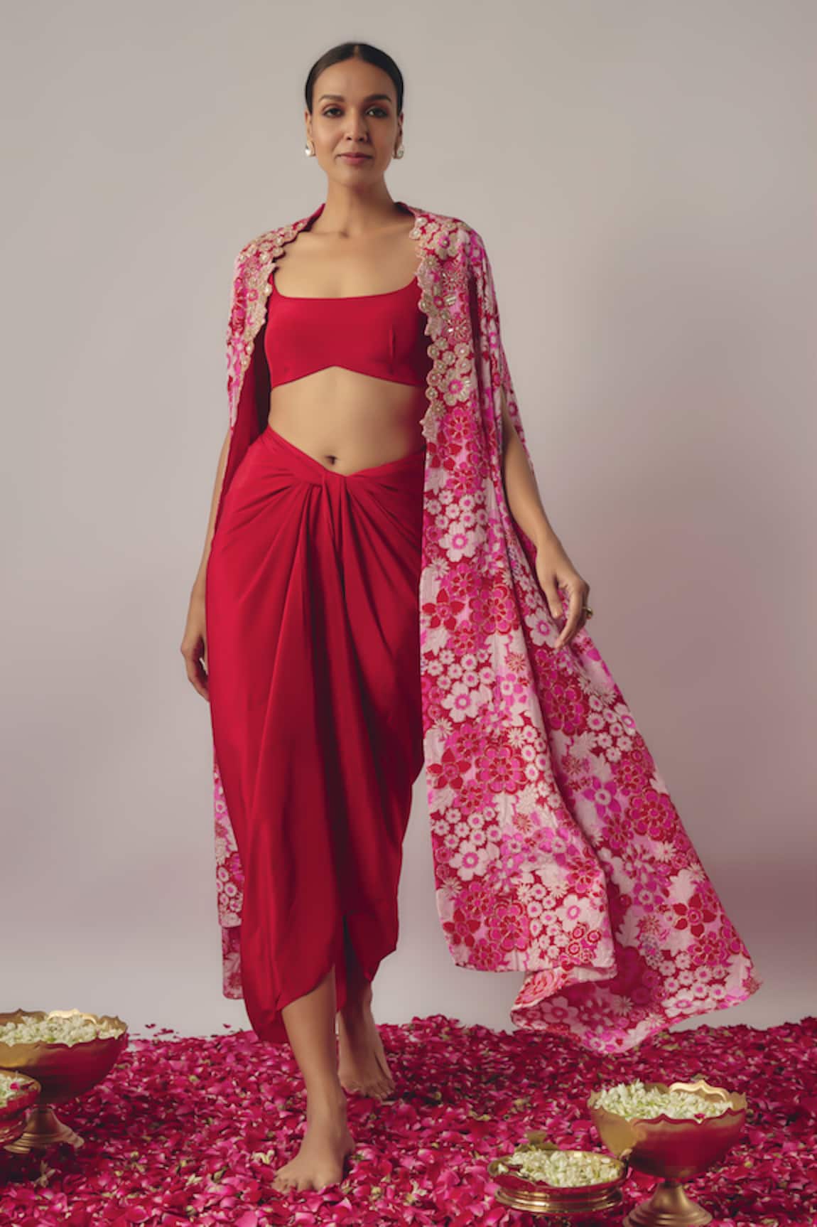 Bahar Bloom Print & Embroidered Cape Draped Skirt Set