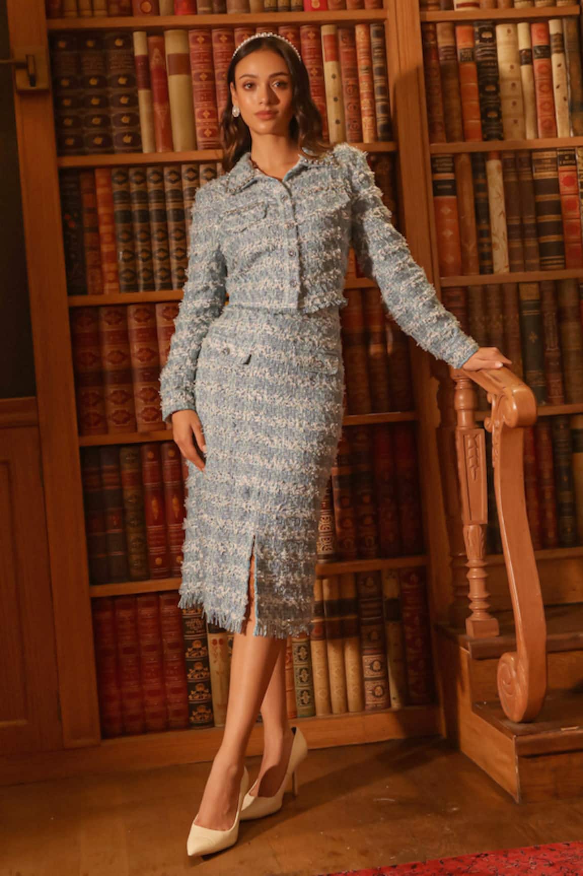 Tweed Blue Dress With Cuff Sleeve Shirt
