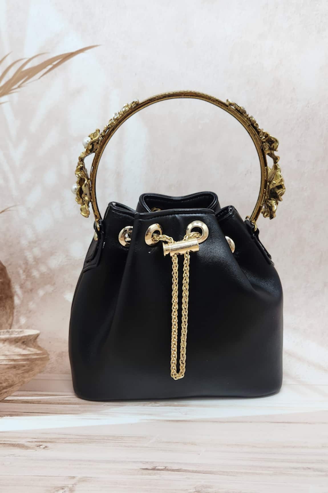 Carved Handle Pearl Embellished Bucket Bag