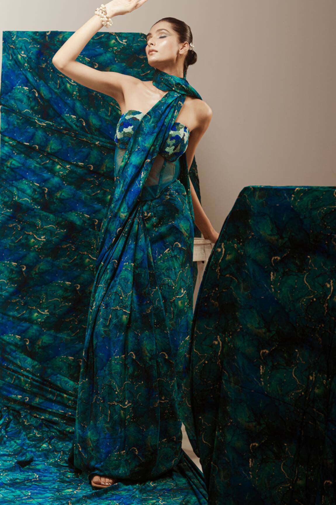 Abstract Print Pre-Draped Saree With Corset