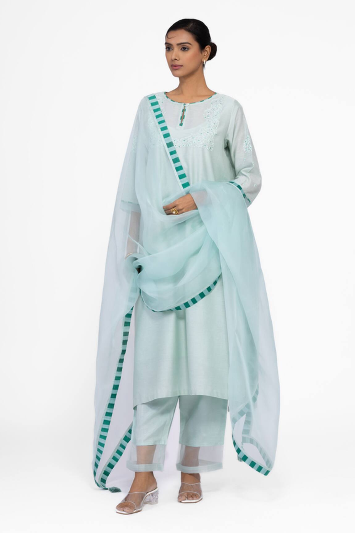 Embroidered Mint Chanderi Silk Kurta Set