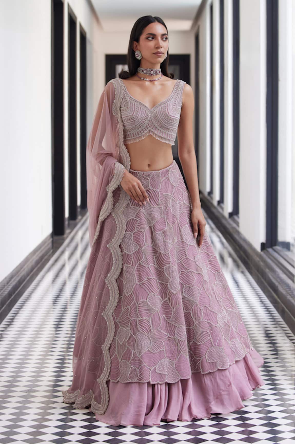 Charu And Vasundhara Pink Embroidered Fish Cut Lehenga Set