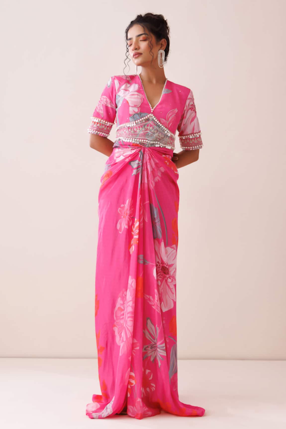 Fern Floral Pre-Draped Ruffle Saree & Bustier