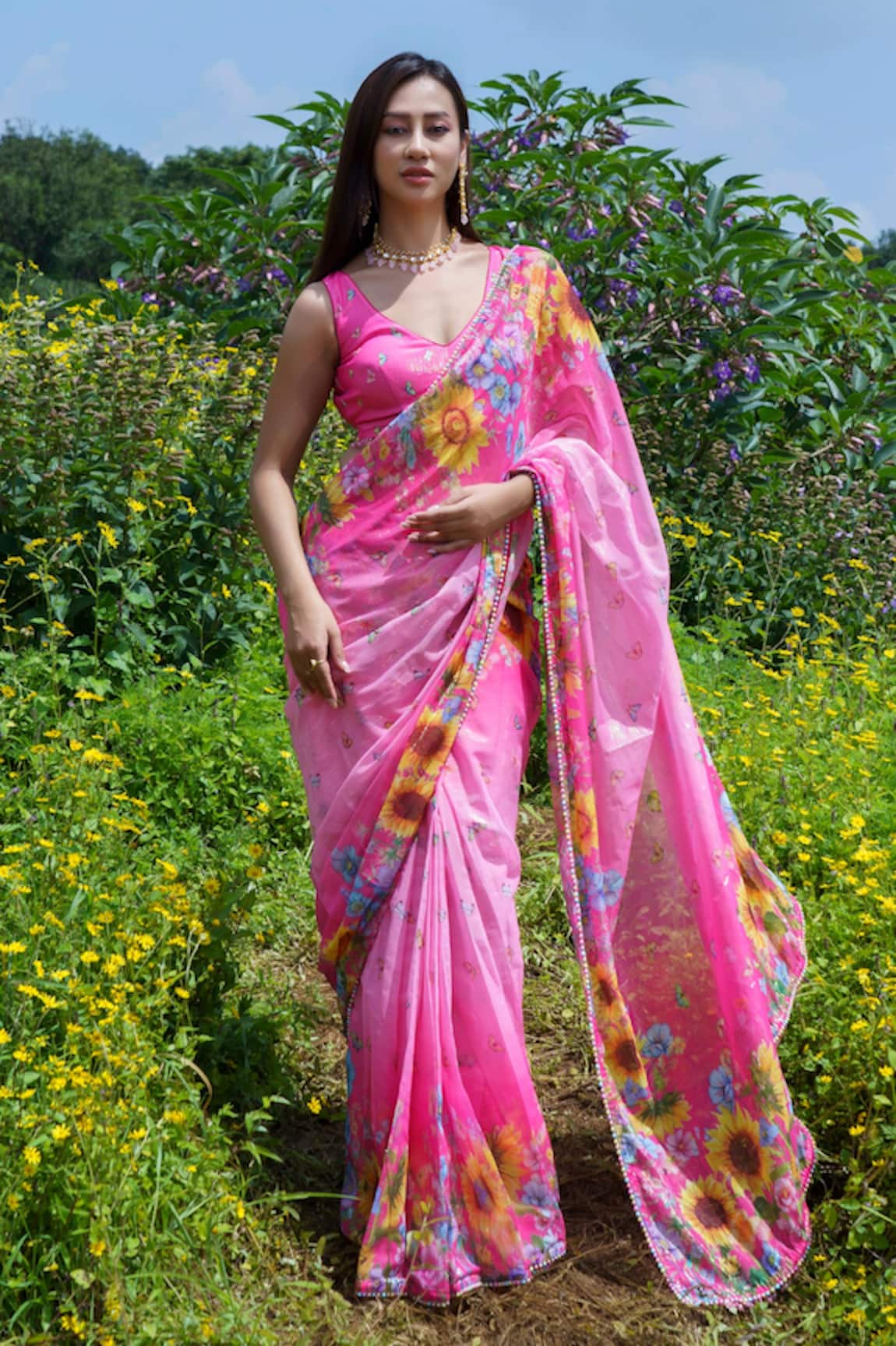 Floral Print Pink Georgette Pre-Draped Saree Set