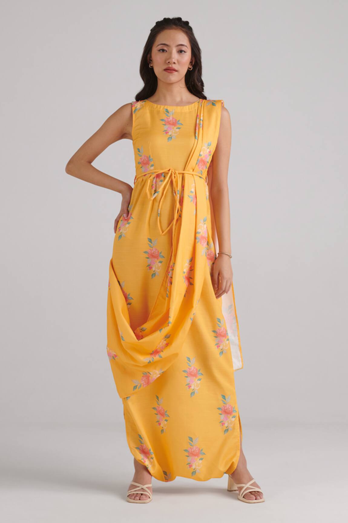 Gardenia Print Pre-Draped Dhoti Saree With Blouse