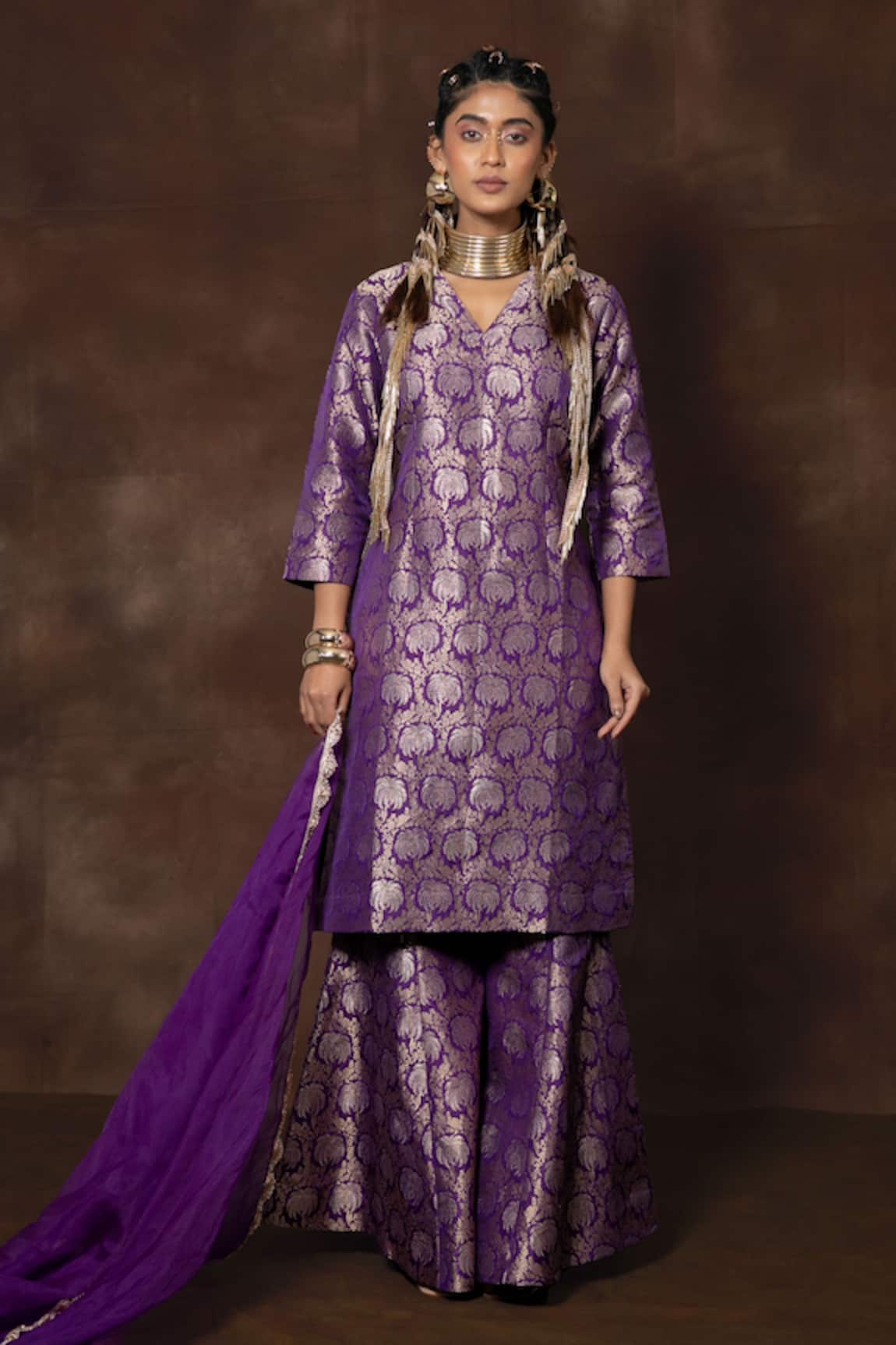 Purple Banarasi Silk Kurta Sharara Set