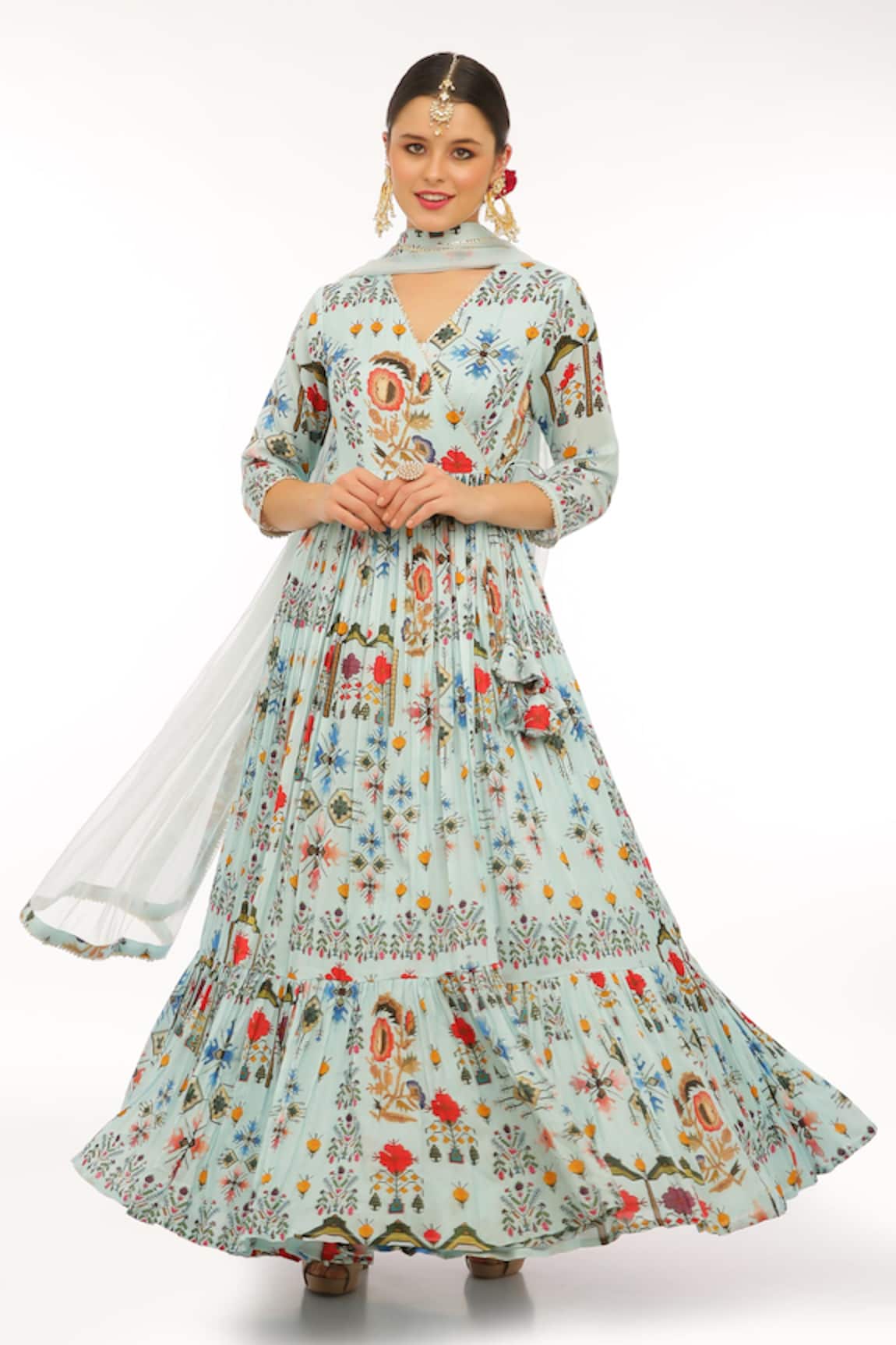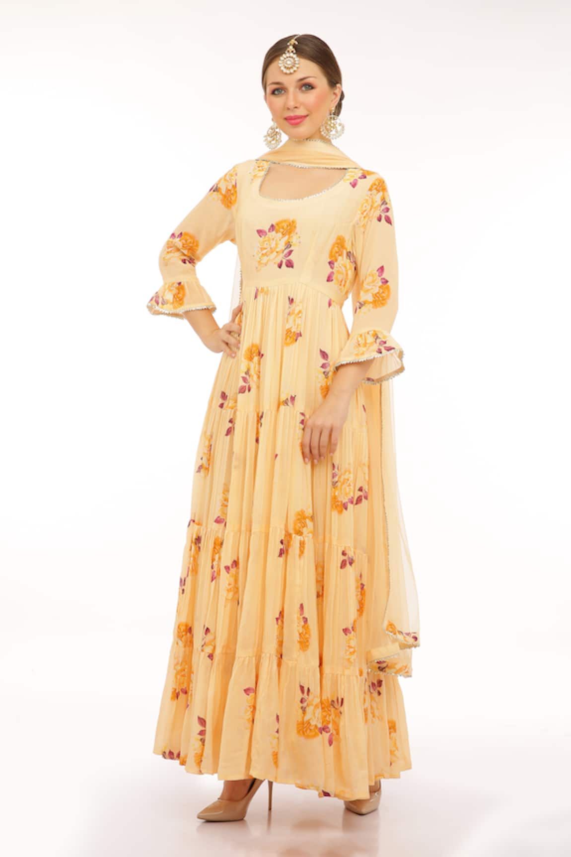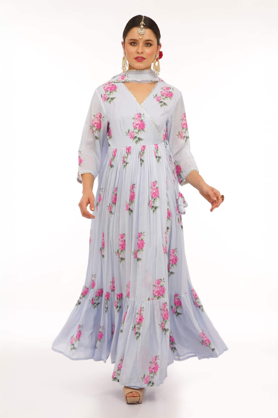 Embroidered Big Flower Angarkha With Dupatta