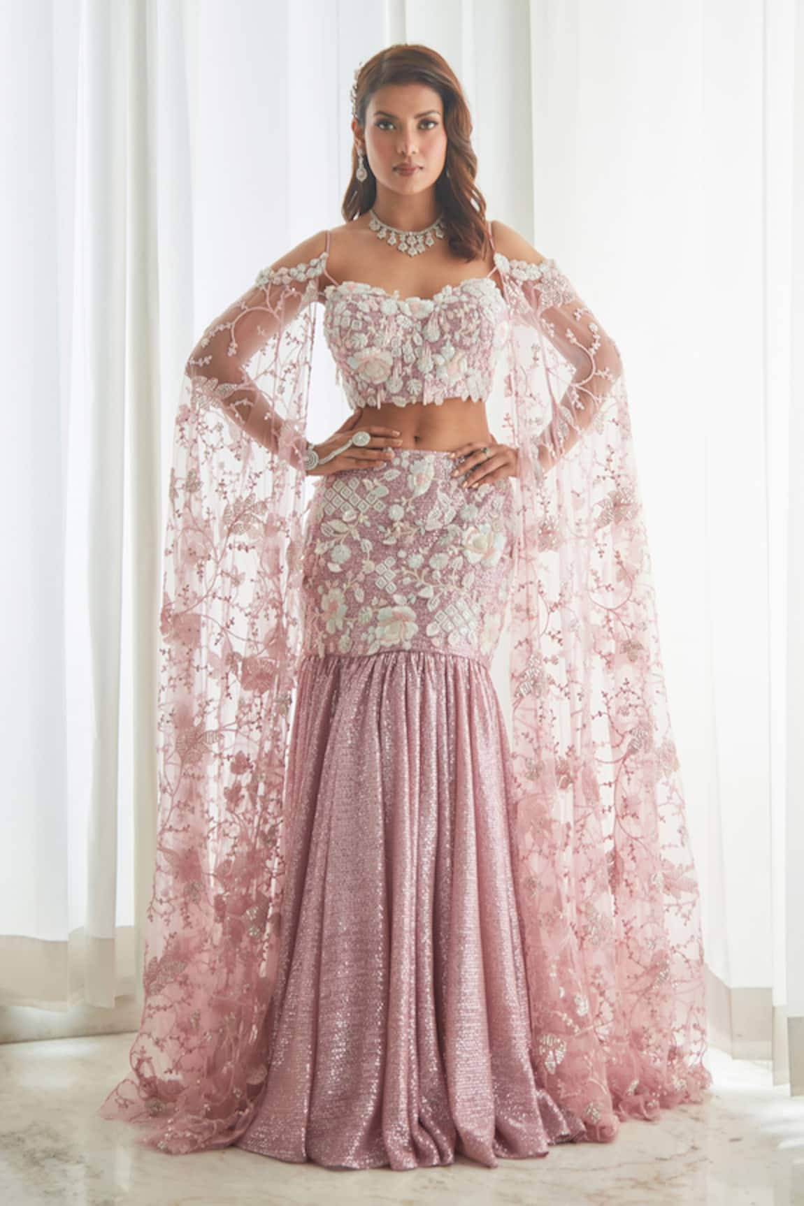 Damask Sequin Bloom Long Cape Draped Skirt Set