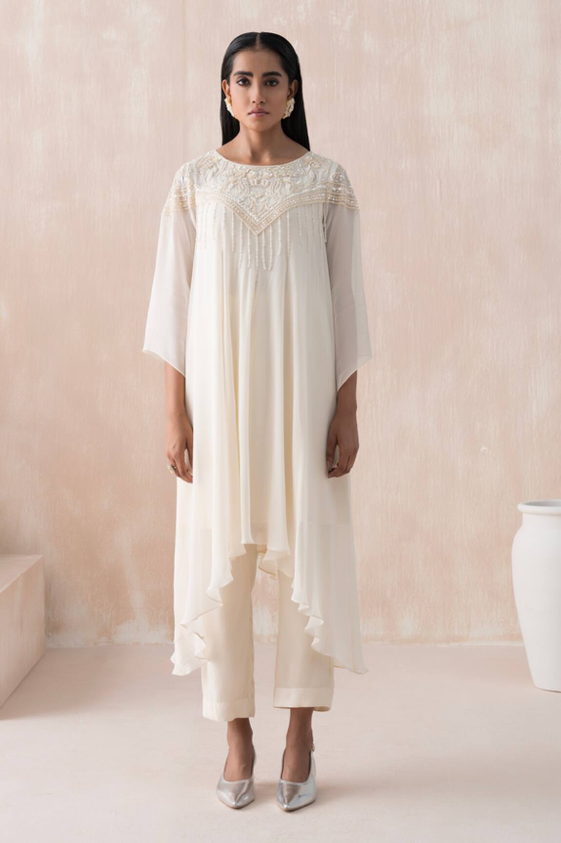 Tonal Floral Embroidered Asymmetric Tunic With Trouser