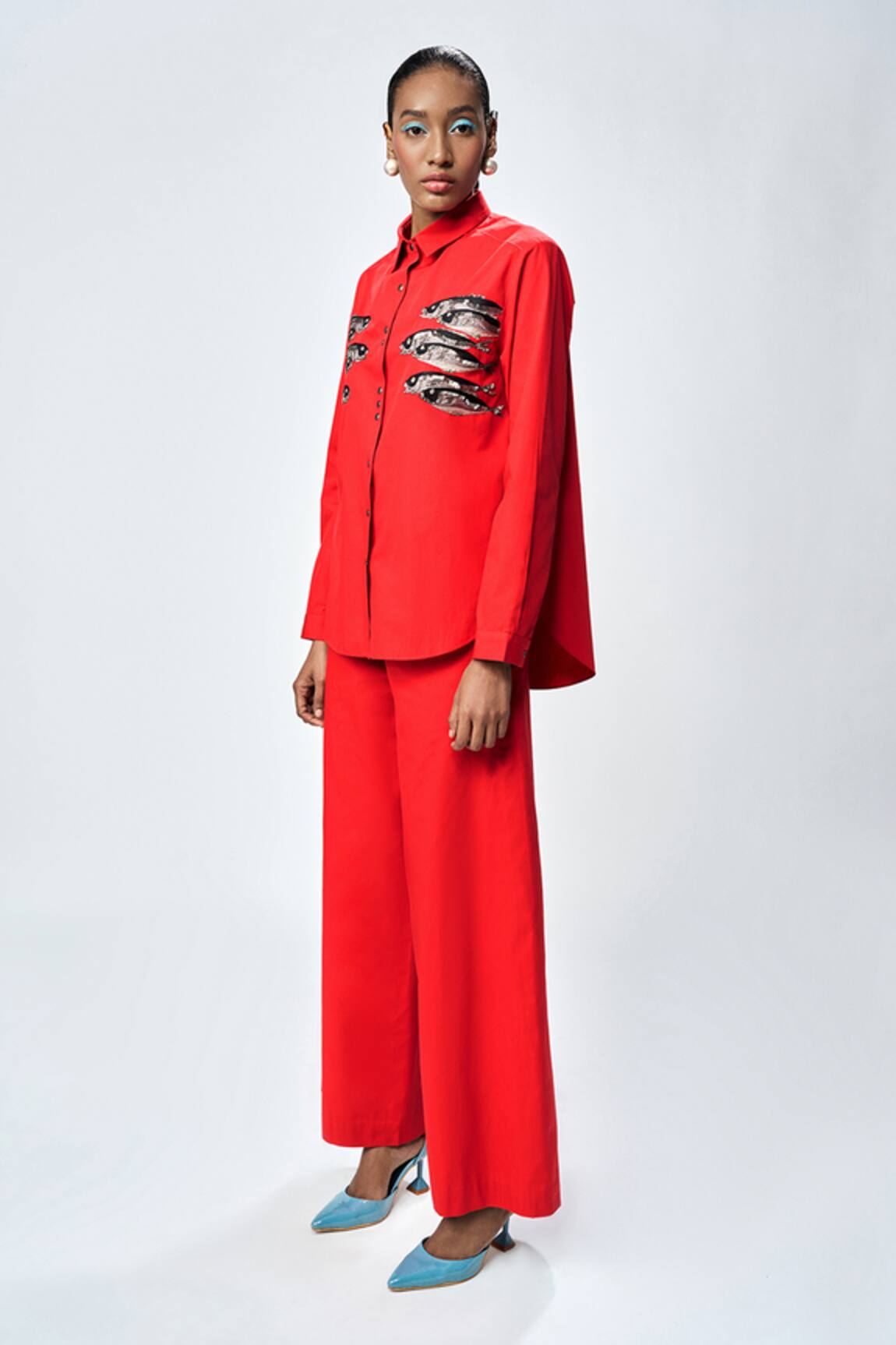 Abstract Rose Embroidered Shirt & Flared Pant Set