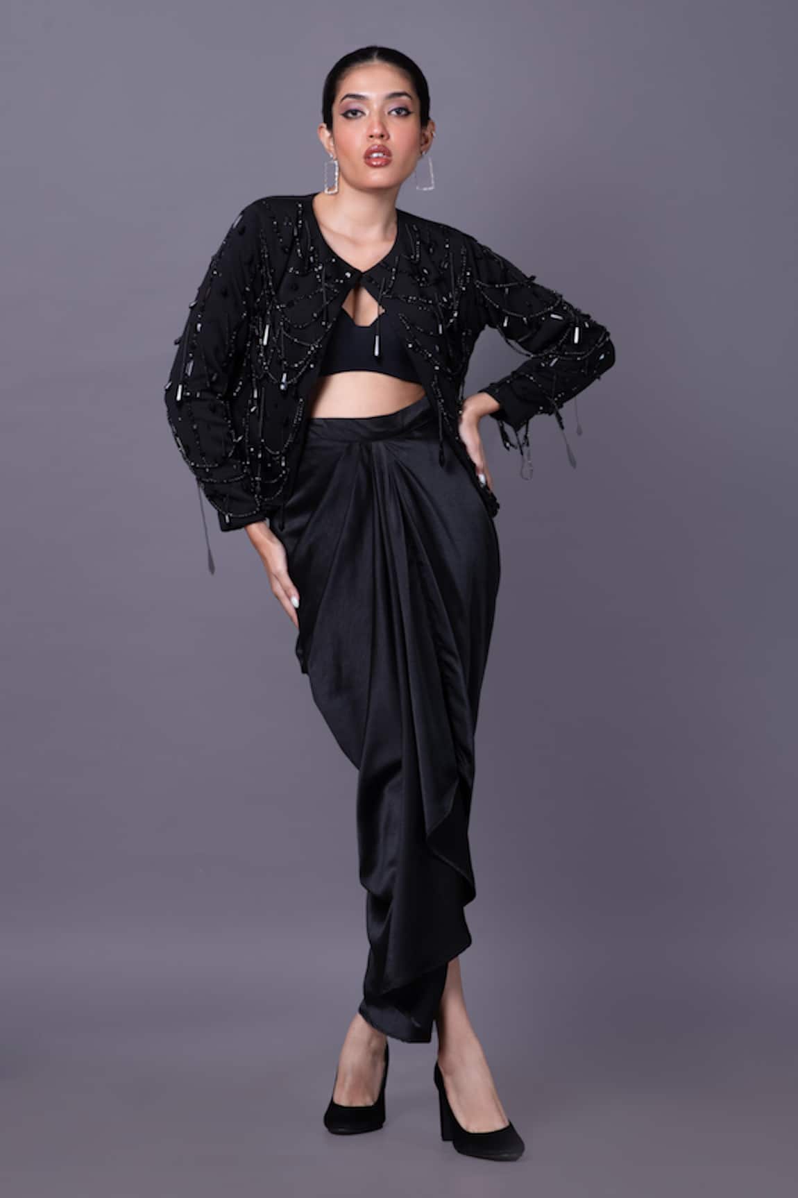 Bead Embroidered Jacket With Draped Skirt