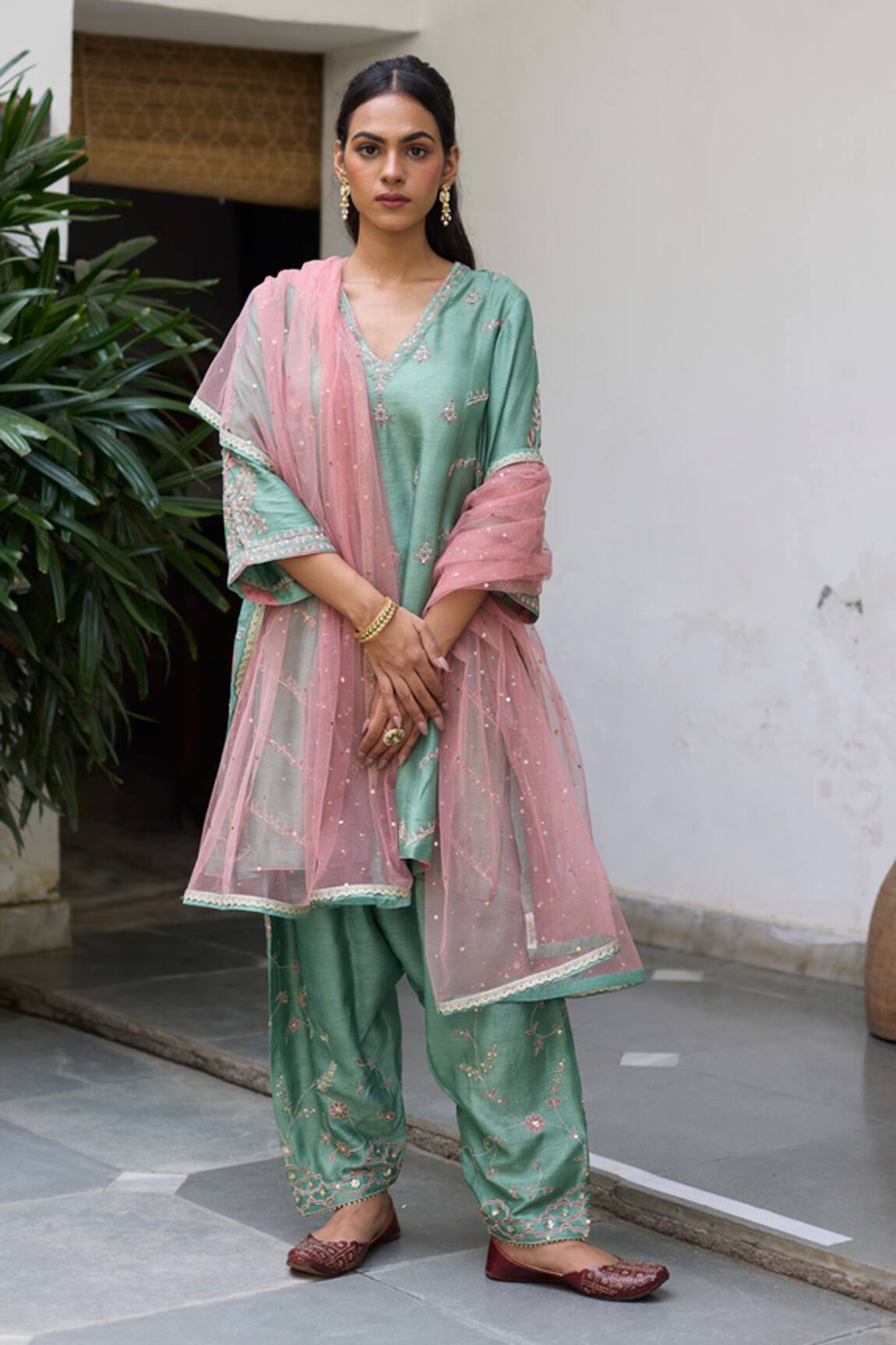 Zari & Floral Embroidered Kurta & Pant Set