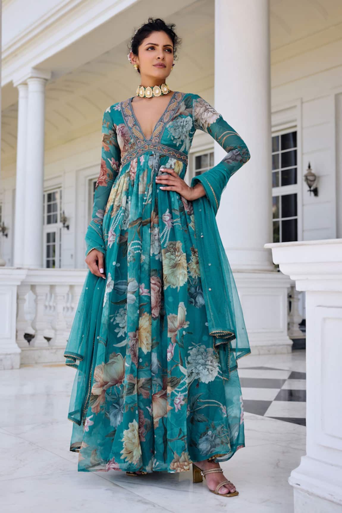 Yasir Printed Aqua Kurta Set With Ivory Pants