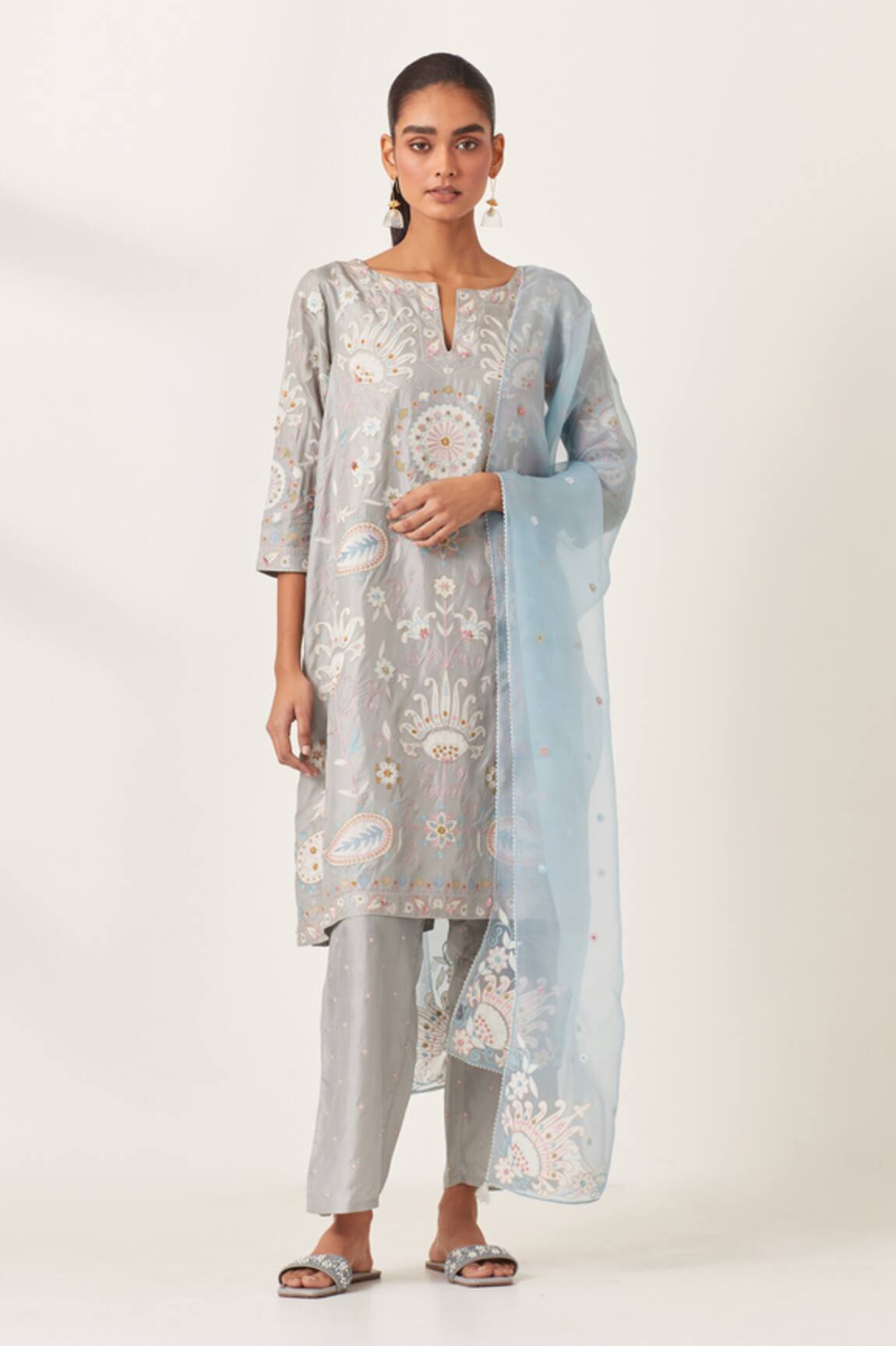 Silk Floral Jaal Applique Work Kurta Pant Set