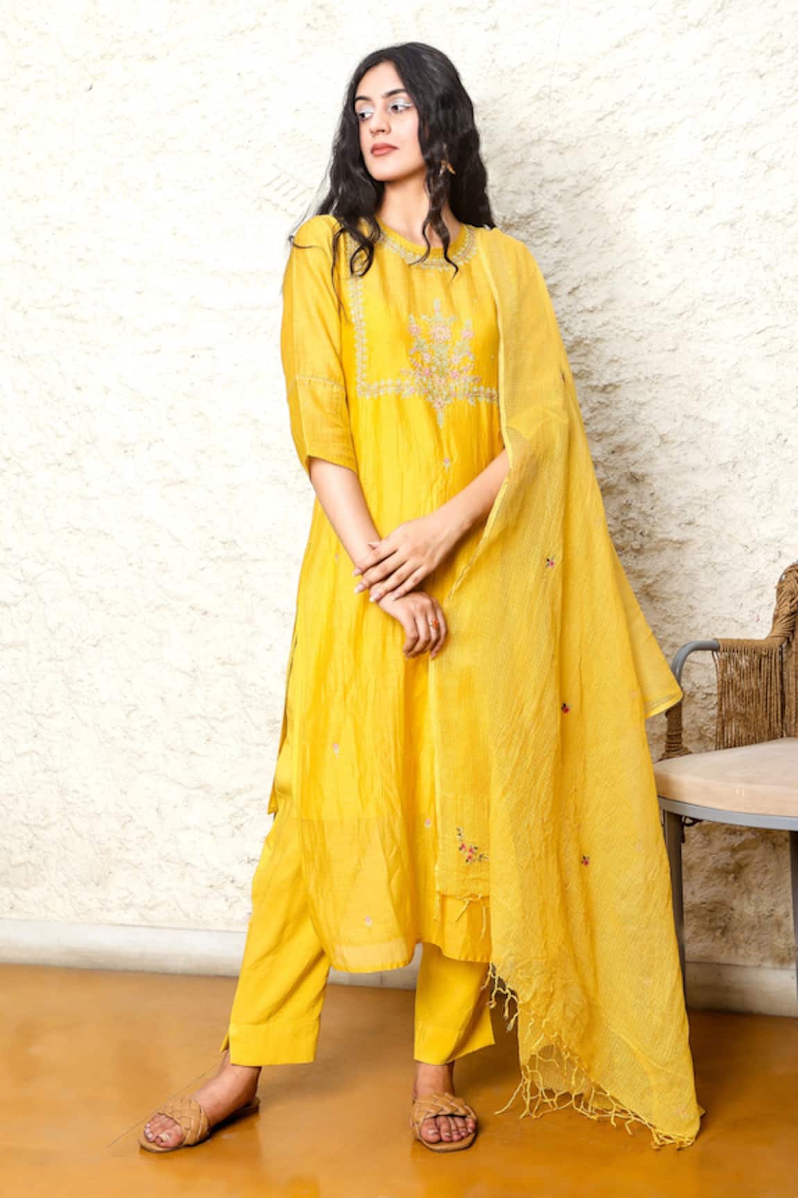 Handloom Chanderi Flower Embroidered Kurta & Pant Set