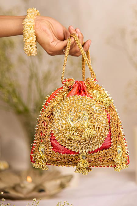 No of Component: 1Components: Potli BagNoteworthy Feature: Intricate golden embroidery with peacock motifs, Decorative tassels with golden beads, Rich brocade fabric with vibrant orange hueOccasions: Festive occasionsStyle Genre: Indian stylePattern: EmbroideredType of Work: Embroidery, TasselsColor: OrangeComposition: FabricSize Details: Height: 23 cms, Height With Handle: 33 cms, Depth: 20 cms, Width: 20 cmsWeight Details: Weight: 800 gmsVisible Items not included: Only single piece potli bag is being sold.Care Instruction: dry clean onlyClosure Style: Drawstring closureCompartment Style: Single compartmentExact Length: Height: 9 inches, Width: 8 inchesExact Weight: Weight: 800 gramsExact Width: Width: 8 inchesExterior Features: Rich gold embroideryHandle Drop Length: Comfortable handle drop lengthHandle Style: Double handle styleInterior Features: Dupion lined interiorIs Handle Detachable: Handles are not detachableSize: Medium sizeStrap Length: Short strapStrap Type: Single drawstring strapType: Potli bagWeight: 800 grams