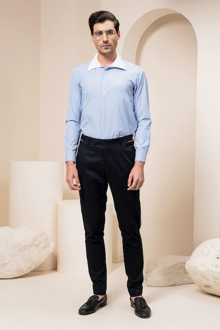 Blue cotton striped shirt with panelled detail and concealed front placket.