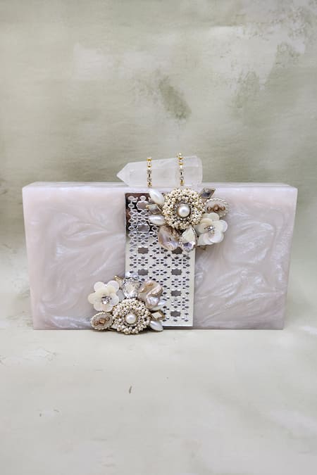 White resin clutch featuring a laser cut flower embellishment and a top crystal knob