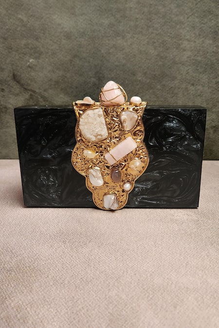 Black Stone Theos Carved Metal Embellished Clutch Bag