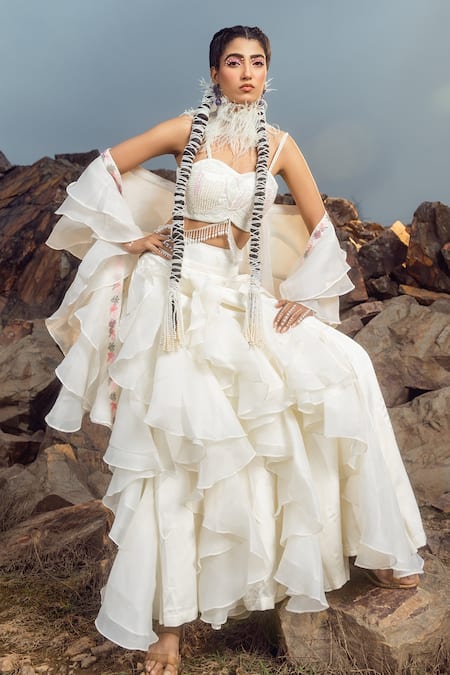 Ivory bustier featuring pearl embroidery in floral pattern and sweetheart neckline. Paired with a frill dupatta and 3D layered pant.