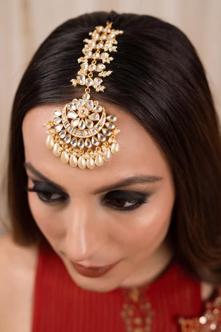 Gold plated half crescent maangtikka featuring intricate kundan and polki embellishments with white bead drops