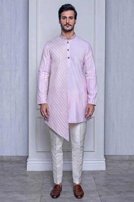 Pink asymmetrical kurta with resham embroidered motifs & metal trims.