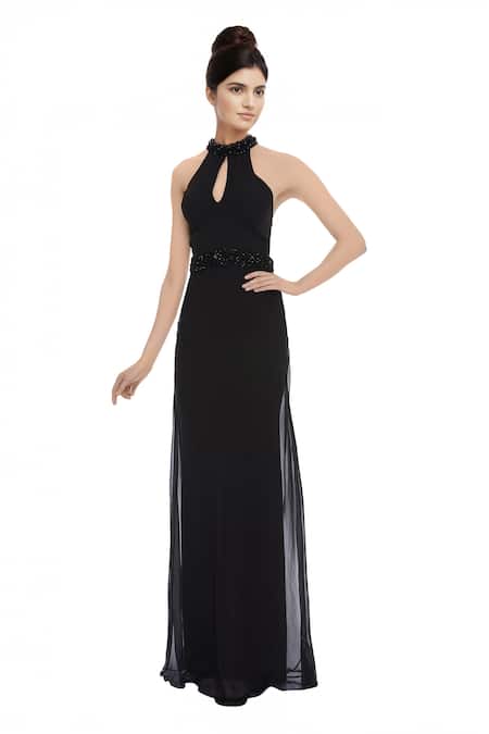 A perfect evening party gown is this black georgette floor length gown with cutdana & bead embroidery.
