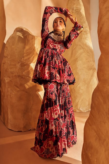 Black peplum kurta featuring all-over red gulbahar print, embroidery on the neckline, and a cutout at the back. Paired with a printed sharara in coordinating design.