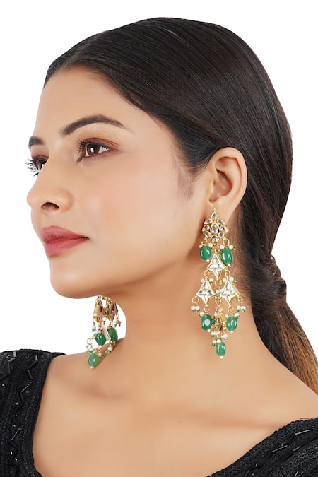 Gold plated dangler earrings featuring intricate cutwork detailing and studded with kundan stones