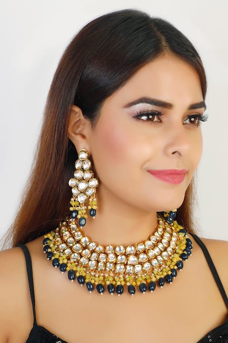 Gold-plated choker featuring encrusted kundan with lime green and blue bead cluster drops. Paired with matching dangler earrings adorned with similar bead clusters.