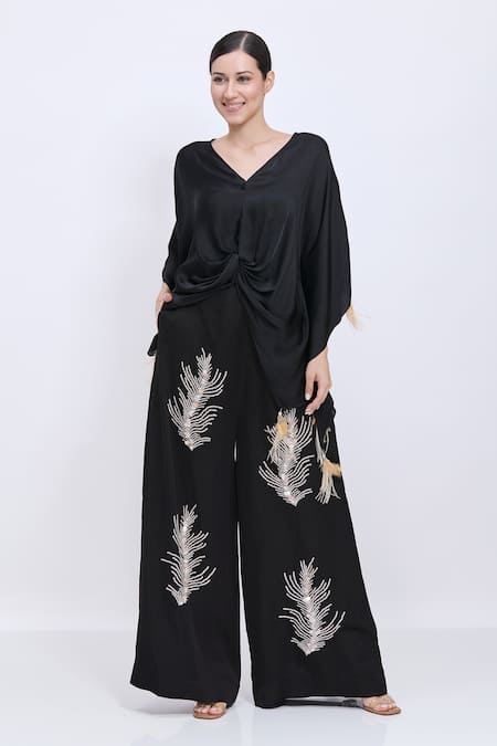 Black palazzo crafted from blended linen, featuring copper sequin fern hand embroidery.