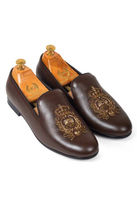 Brown handcrafted leather loafers with zardozi embroidery, padded leather lining & hardsheet sole.