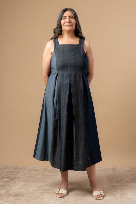 Blue dress made from upcycled denim featuring a square neckline and pleated design