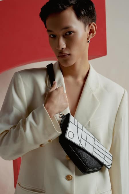 Black handcrafted leather fanny pack featuring a geometric design. It comes with a detachable strap for versatile carrying options.