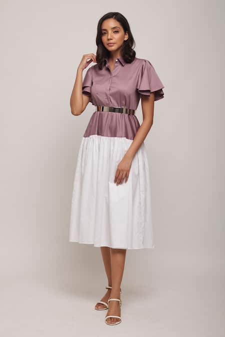 Light purple colorblock midi dress featuring a collared neck and flared sleeves