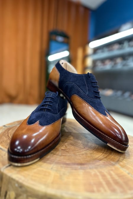 Tan and navy lace-up oxford shoes featuring suede stitch detailing and wingtip design
