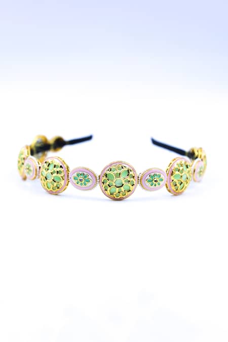 Gold tone multicolour floral cut-out brooch hairband studded with crystal and beads