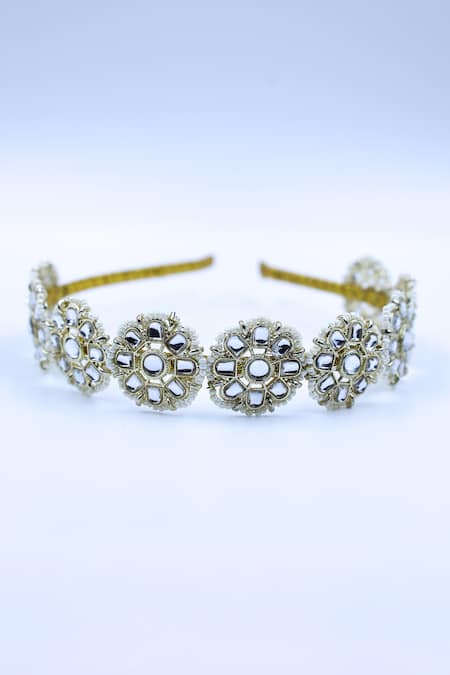 Gold tone floral brooch hairband featuring crystal and bead embellishments