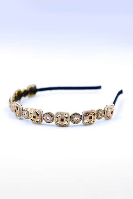 Gold tone pink geometric brooch hairband featuring crystal and bead embellishments