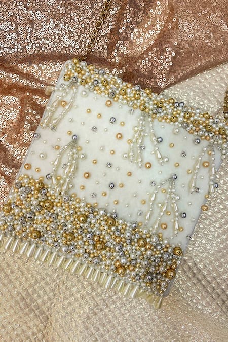 Ivory sling bag embellished with gold, silver, and cream pearls
