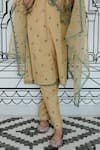 Beige kurta featuring notched neckline with thread and mirror embroidery in floral pattern. Paired with matching pant and lace border embellished dupatta.