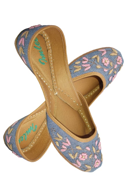 Denim blue juttis featuring hand-embroidered pink and grey floral designs