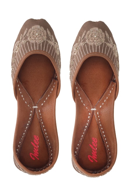 Brown mojari featuring intricate zardosi floral embroidery and a cushioned sole