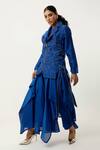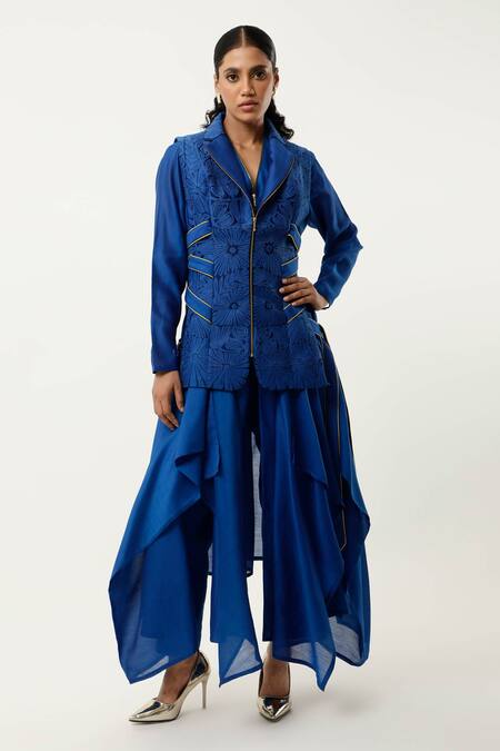 Blue cutwork jacket featuring a notched lapel and full sleeves. Paired with an asymmetric hem draped kurta and matching pant.